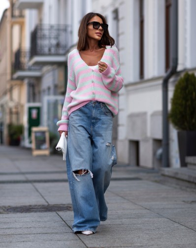 Sweter damski o luźnym kroju, zapinany na guziki z dekoltem w kształcie litery V. Wzór w żółto-niebieskie paski nadaje mu świeżego, energetycznego charakteru. Idealny do jeansów i spódnic, sprawdzi się w codziennych stylizacjach przez cały rok.
