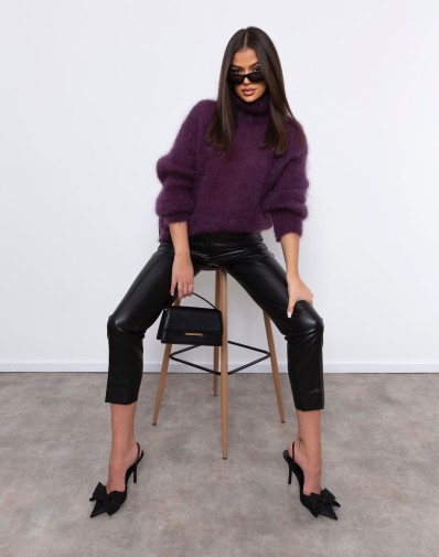 Miękki, oversize'owy sweter w odcieniu przepięknego fioletu to idealny wybór na chłodniejsze dni. Wykonany z grubego, przyjemnego w dotyku kid moheru , zapewnia komfort i swobodę ruchów. Posiada wysoki golf, który dodaje ciepła i stylu. Luźny krój i delikatnie opuszczone ramiona nadają mu modny, casualowy wygląd. Świetnie komponuje się zarówno z jeansami, jak i eleganckimi spodniami.