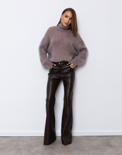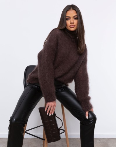 Miękki, oversize'owy sweter w odcieniu przepięknego brązu to idealny wybór na chłodniejsze dni. Wykonany z grubego, przyjemnego w dotyku kid moheru , zapewnia komfort i swobodę ruchów. Posiada wysoki golf, który dodaje ciepła i stylu. Luźny krój i delikatnie opuszczone ramiona nadają mu modny, casualowy wygląd. Świetnie komponuje się zarówno z jeansami, jak i eleganckimi spodniami.