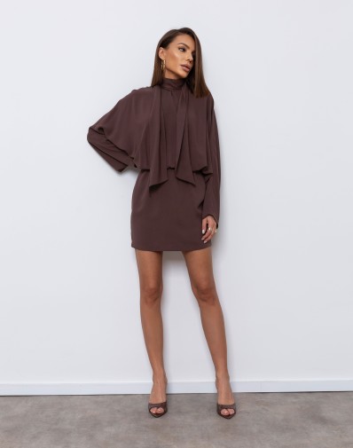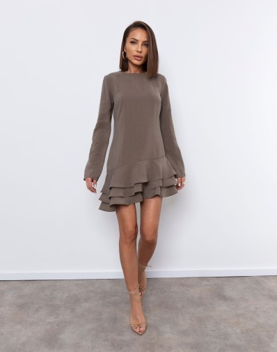 Sukienka mini o rozkloszowanym kroju wykonana z lekkiego, delikatnie połyskującego materiału. Góra z długimi rękawami i wiązaniem przy szyi dodaje elegancji, a wielowarstwowy, falbaniasty dół nadaje całości lekkości i objętości.Falbany wykończone usztywnieniem. W pasie wszyta guma podkreśla talię i zapewnia wygodne dopasowanie. Stylowy model idealny na przyjęcia, kolacje i wyjątkowe okazje.