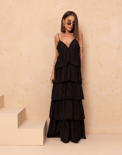 Elegancka sukienka maxi w czarnym odcieniu, o minimalistycznym kroju. Bez rękawów, z zabudowanym dekoltem i subtelnym zapięciem z tyłu, pięknie układa się na sylwetce. Prosty fason z delikatnym rozszerzeniem ku dołowi sprawia, że jest idealna zarówno na co dzień, jak i na bardziej eleganckie okazje.