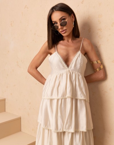 Sukienka maxi o asymetrycznym kroju w kolorze śmietankowym.