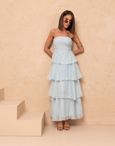 Zmysłowa i lekka sukienka maxi z efektownymi, warstwowymi falbanami, które pięknie układają się w ruchu. Model z odkrytymi ramionami ,bez ramiączek dodają kobiecego charakteru.W buście wszyta guma dzięki czemu sukienka nie opadnie.Z tyłu na plecach elastyczny materiał przez co sukienka idealnie dopasuje się do biustu.Odkryte ramiona i subtelne warstwy falban nadają całości wyjątkowej lekkości. Idealna na letnie dni i wieczorne wyjścia.