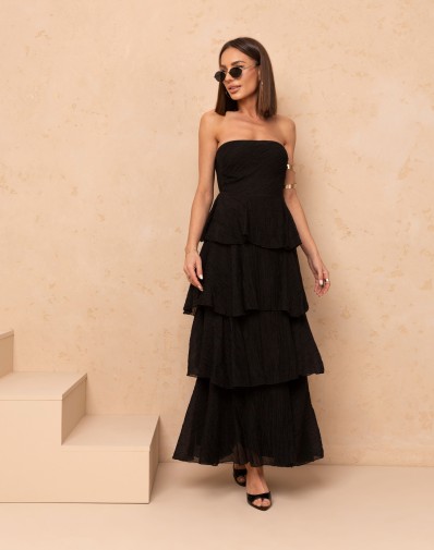 Zmysłowa i lekka sukienka maxi z efektownymi, warstwowymi falbanami, które pięknie układają się w ruchu. Model z odkrytymi ramionami ,bez ramiączek dodają kobiecego charakteru.W  buście wszyta guma dzięki czemu sukienka nie opadnie.Z tyłu na plecach elastyczny materiał przez co sukienka idealnie dopasuje się do biustu.Odkryte ramiona i subtelne warstwy falban nadają całości wyjątkowej lekkości. Idealna na letnie dni i wieczorne wyjścia.