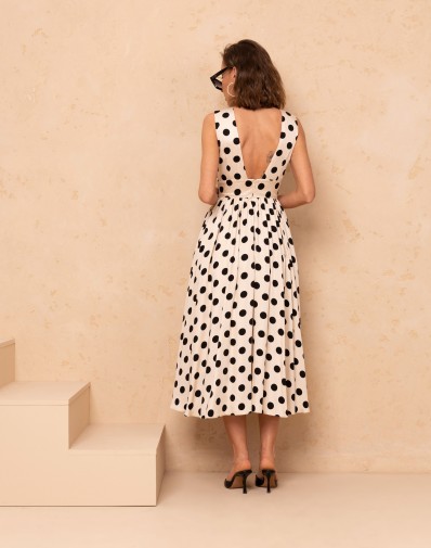 Sukienka w grochy w stylu lat 70. Wykonana z lekkiego materiału, ma długość midi i jest podszewkowana delikatnym tiulem, co dodaje jej wyjątkowego uroku. Grube ramiączka zapewniają komfort noszenia, a elegancko wycięte plecy nadają jej zmysłowego charakteru. Sukienka zapinana jest na kryty zamek z tyłu, co podkreśla jej elegancki wygląd. Idealna na różne okazje – od przyjęć po letnie spotkania w gronie przyjaciół.