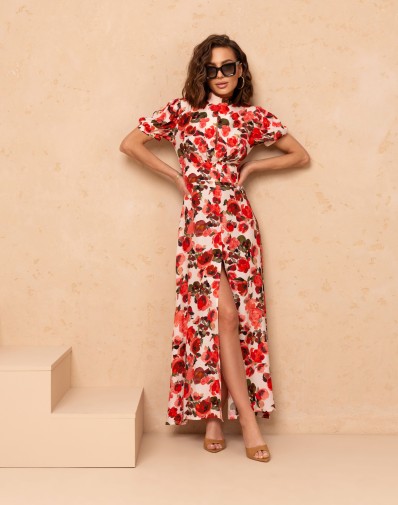 Kobieca sukienka midi w efektowny, kwiatowy wzór, która przyciąga spojrzenia i podkreśla sylwetkę. Dopasowana góra z delikatnym rozcięciem na biuście, z krótkim rękawem oraz zaznaczoną talią pięknie modelują figurę. Subtelne rozcięcie na nodze dodaje lekkości i zmysłowego charakteru. Idealna propozycja na wyjątkowe okazje, jak i letnie wyjścia.