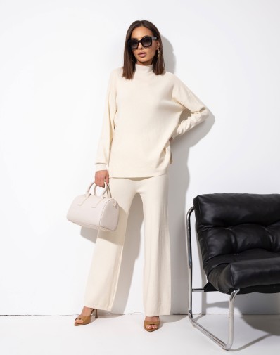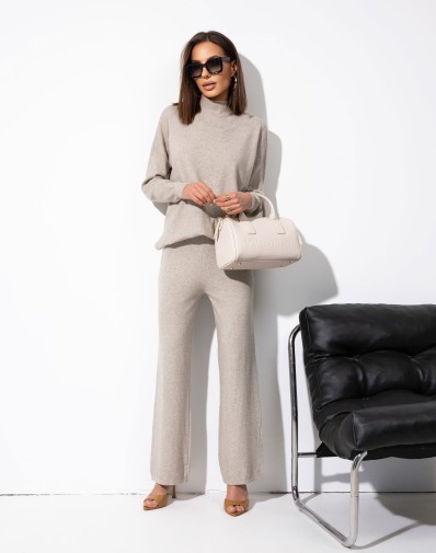 Komplet sweterkowy składający się z gładkich spodni z szeroką nogawką na elastycznej gumce, bez kieszeni, oraz luźnego półgolfu z długim rękawem. Model półgolfu posiada rozcięcia po bokach u dołu, co dodaje lekkości i swobody noszenia. Stylowy i komfortowy zestaw idealny do codziennych stylizacji.