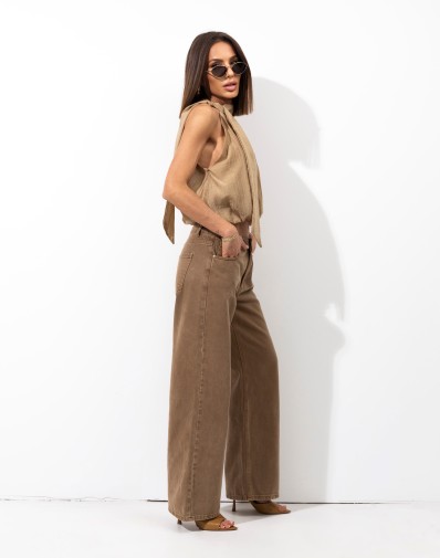Spodnie jeansowe o fasonie z szeroką nogawką, wykonane z elastycznego dżinsu, na bokach lampas . To model z wysokim stanem, zapinany na guzik i suwak. Zarówno z przodu, jak i tyłu znajdują się funkcjonalne kieszenie. Wysoki stan pięknie podkreśla talię, a szerokie nogawki optycznie wydłużają sylwetkę i dodają nonszalanckiego luzu.Idealne do codziennych stylizacji – od sneakersów po szpilki.