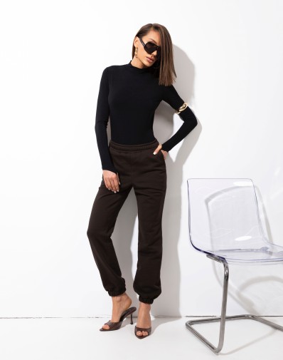 Komplet czekoladowy o luźnym kroju z wysokiej jakości tkaniny jakości premium. Koszula z kołnierzykiem, Zapinana na guziki. Obniżona linia ramion i wydłużone, efektowne mankiety. Spodnie z wysokim stanem. Zakładki z przodu. tył gładki .Zamek kryty z boku, w pasie szlufki. Komplet wyróżnia dopinany kwiat , który dodaje romantycznego akcentu. Wprowadza subtelny, kobiecy element do stylizacji.
