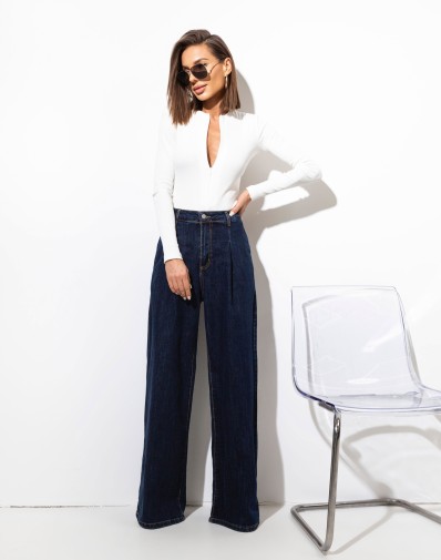 Spodnie jeansowe o fasonie z szeroką nogawką, wykonane z elastycznego materiału. To model z wysokim stanem, zapinany na guzik i suwak. Zarówno z przodu, jak i tyłu znajdują się funkcjonalne kieszenie. Delikatne zakładki z przodu.Wysoki stan pięknie podkreśla talię, a szerokie nogawki optycznie wydłużają sylwetkę i dodają nonszalanckiego luzu.Idealne do codziennych stylizacji – od sneakersów po szpilki.