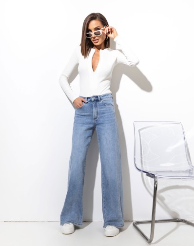 Spodnie jeansowe o fasonie z szeroką nogawką, wykonane z elastycznego dżinsu. To model z wysokim stanem, zapinany na guzik i suwak. Zarówno z przodu, jak i tyłu znajdują się funkcjonalne kieszenie. Wysoki stan pięknie podkreśla talię, a szerokie nogawki optycznie wydłużają sylwetkę i dodają nonszalanckiego luzu.Idealne do codziennych stylizacji – od sneakersów po szpilki.