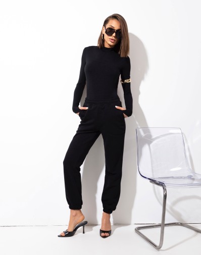 Te spodnie to idealne połączenie wygody i stylu. Uszyte z miękkiej, ale trwałej tkaniny w głębokiej czerni, wyróżniają się prostym, lekko luźnym krojem, który pięknie układa się na sylwetce. Wysoki stan optycznie wydłuża nogi i podkreśla talię, a klasyczne kieszenie nadają im ponadczasowego charakteru. To model, który doskonale sprawdzi się zarówno w casualowych, jak i bardziej eleganckich stylizacjach – wystarczy dodać szpilki albo sneakersy.