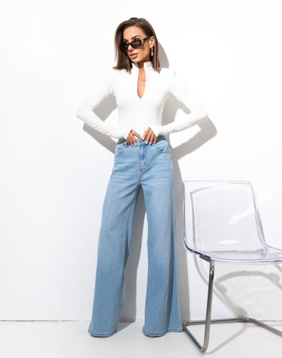 Stylowe i wygodne spodnie jeansowe z szerokimi nogawkami z wysokim stanem.Szerokie nogawki oraz ozdobne,złote guziki przy pasie nadają im nowoczesny,elegancki charakter .Wykonane z miękkiego denimu w klasycznym niebieskim odcieniu jeansu.Idealne zarówno do casualowych jak i bardziej szykownych stylizacji.