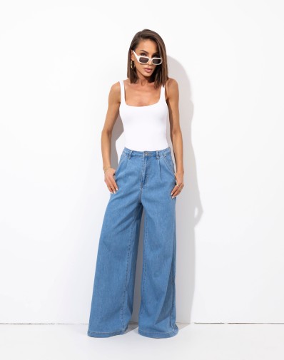Spodnie jeansowe o fasonie z szeroką nogawką, wykonane z elastycznego materiału. To model z wysokim stanem, zapinany na guzik i suwak. Zarówno z przodu, jak i tyłu znajdują się funkcjonalne kieszenie. Delikatne zakładki z przodu.Wysoki stan pięknie podkreśla talię, a szerokie nogawki optycznie wydłużają sylwetkę i dodają nonszalanckiego luzu.Idealne do codziennych stylizacji – od sneakersów po szpilki.