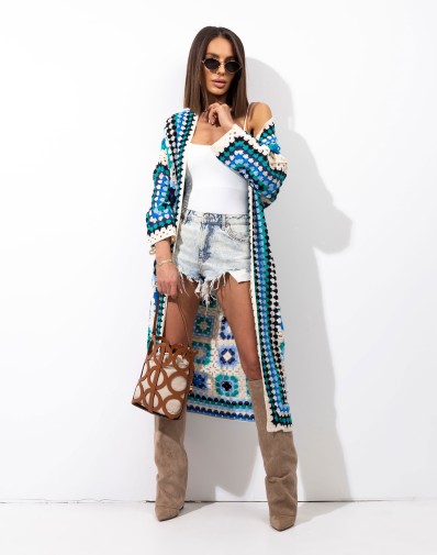 Długi kardigan o ażurowym splocie, który przyciąga uwagę efektownym, kolorowym wzorem. Lekki i przewiewny, idealnie sprawdzi się jako stylowe uzupełnienie letnich stylizacji. Luźny fason zapewnia swobodę noszenia, a jego długość optycznie wysmukla sylwetkę. Świetny zarówno na co dzień, jak i na wakacyjne wyjazdy.