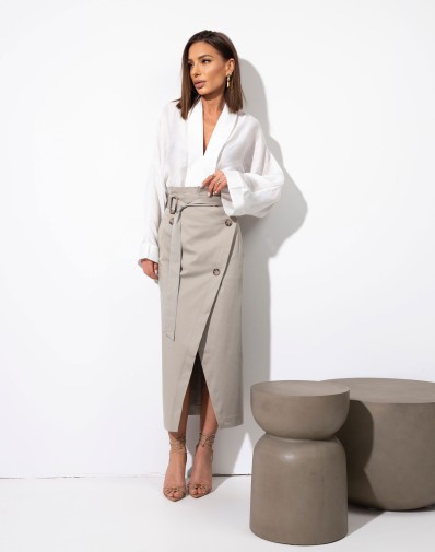 Elegancka spódnica midi z wysokim stanem, zapinana na guziki z przodu. Model ołówkowy z rozcięciem, podkreślający sylwetkę i dodający lekkości. Pasek w talii pięknie akcentuje figurę, a klasyczny beżowy kolor sprawia, że spódnica świetnie komponuje się zarówno z prostymi topami, jak i eleganckimi koszulami. Idealna na co dzień i do biura.