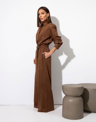 Stylowy komplet wykonany z miękkiego, przyjemnego w dotyku zamszu. Koszula o lekko oversize’owym kroju z poduszkami w ramionach nadaje sylwetce nowoczesny, elegancki kształt. Spodnie z szerokimi nogawkami i elastyczną gumką z tyłu w pasie zapewniają idealne dopasowanie i komfort noszenia. Całość tworzy wyjątkowo modny, a jednocześnie wygodny zestaw — idealny zarówno na co dzień, jak i na specjalne okazje.