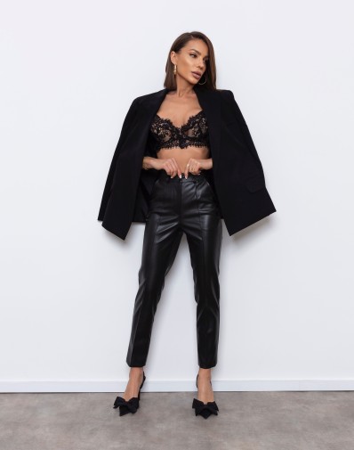 Efektowny kombinezon wykonany z miękkiej eko skóry w odcieniu czerni, przeszytej kontrastową, białą nicią. Góra jest dopasowana i gładko przylega do sylwetki aż do okolicy ud, gdzie nogawki rozszerzają się w modny fason dzwonów. Model zapinany z przodu na zamek, a przy szyi na guziki, co dodaje mu charakteru. Posiada odkryte plecy oraz wszytą gumę na wysokości biustu z tyłu, dzięki czemu idealnie trzyma się na ciele . Nowoczesny, odważny i wyjątkowo efektowny — idealny na wieczorne wyjścia.