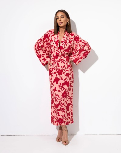 Sukienka midi z rozcięciem z tyłu na wysokości łydek to elegancka propozycja dla kobiet ceniących styl i wygodę. Góra sukienki ma formę kimono z szalowym kołnierzem, co nadaje jej lekkości i swobody. Sukienka zapinana jest na kryty zamek z tyłu, co zapewnia doskonałe dopasowanie. Połączenie kolorów – łososiowego z czerwienią – tworzy efektowny i modny akcent, idealny na różne okazje. To doskonały wybór dla osób szukających unikalnych elementów garderoby.