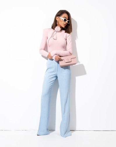 Eleganckie body w różowym odcieniu, uszyte z wyjątkowo przyjemnego w dotyku materiału. Posiada długi rękaw z subtelnymi poduszkami w ramionach, które pięknie podkreślają sylwetkę. Klasyczny, zaokrąglony dekolt dodaje kobiecego uroku, a dołączona materiałowa róża daje możliwość efektownego wiązania na szyi – tworząc oryginalny i zmysłowy akcent stylizacji.