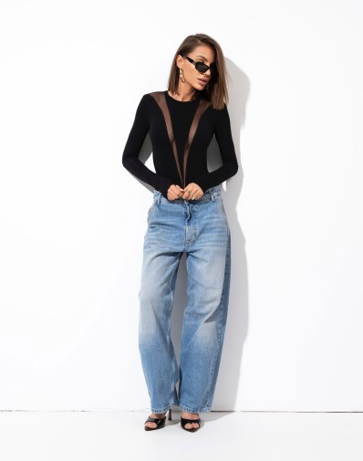 Eleganckie czarne body z transparentnej siateczki w górnej części i na rękawach. Model dopasowany, z efektownym dekoltem w kształcie serca, pięknie podkreślający sylwetkę. Idealne zarówno do jeansów, jak i bardziej eleganckich stylizacji wieczorowych.