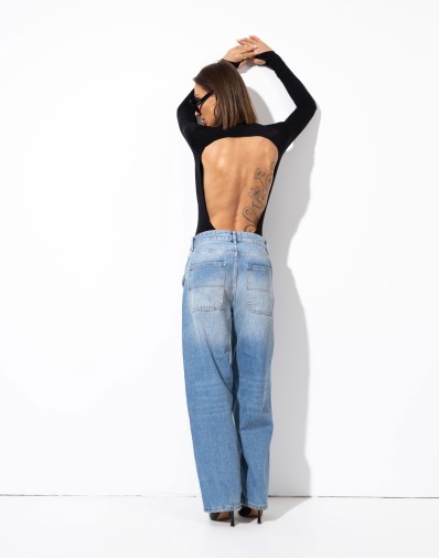 Stylowe off-shoulder body w klasycznej czerni , wykonane z elastycznego, gładkiego materiału, który pięknie dopasowuje się do sylwetki. Model wyróżnia się długimi rękawami oraz efektowną, dopasowaną stójką wokół szyi, nadając całości nowoczesnego charakteru. Body jest zapinane z tyłu na zamek oraz napy, co zapewnia wygodę noszenia i idealne dopasowanie. Świetnie komponuje się zarówno z eleganckimi, jak i bardziej rockowymi stylizacjami.