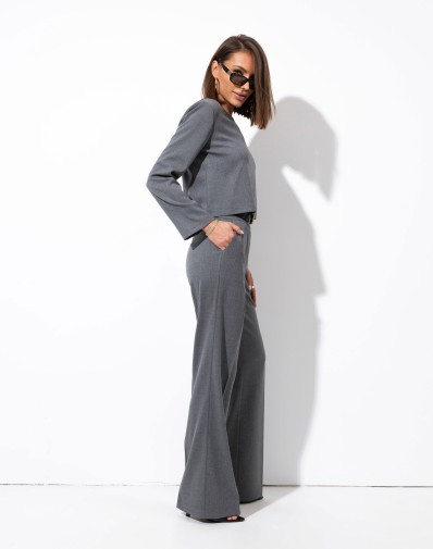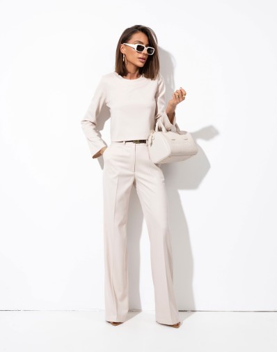 Bluzka o klasycznym kroju z długim rękawem. Zapinana na zamek kryty z tyłu. Zaokrąglony dekolt, w ramionach poduchy.Spodnie z rozszerzaną nogawką. W pasie szlufki. Przód zapinany na klasyczne zapięcie. Z przodu wsuwane kieszenie. Z tyłu patki.