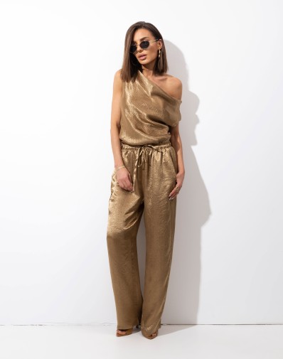 Złota bluzka wykonana z delikatnego, subtelnie połyskującego acetatu, który pięknie układa się na sylwetce. Model bez rękawów, z tyłu dekolt typu łódka, nadaje stylizacji kobiecej lekkości i elegancji. Delikatnie podkreślona talia wysmukla figurę i dodaje całości harmonii. To wyjątkowa propozycja, która doskonale sprawdzi się zarówno w wieczorowych, jak i bardziej minimalistycznych stylizacjach.