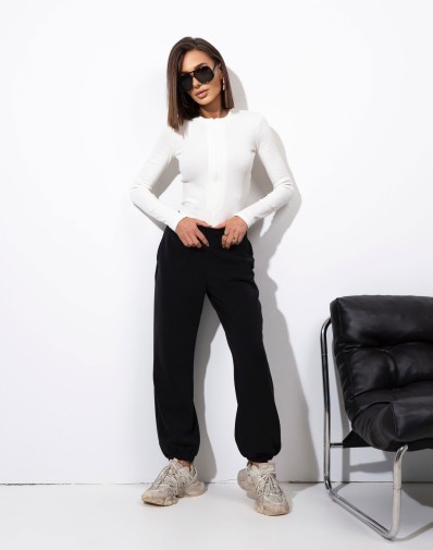 Czarne body z długim rękawem i poduszkami w ramionach. Dopasowany model. Dekolt typu troyer z czarnym zamkiem z przodu, długie rękawy wykończone otworem na palce. Te eleganckie i stylowe body łączą w sobie komfort noszenia z nowoczesnym designem. Suwak z przodu dodaje odrobiny pikanterii, umożliwiając regulację głębokości dekoltu według własnych preferencji.