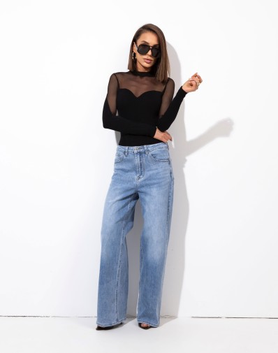 Eleganckie czarne body z transparentnej siateczki w górnej części i na rękawach. Model dopasowany, z efektownym dekoltem w kształcie serca, pięknie podkreślający sylwetkę. Idealne zarówno do jeansów, jak i bardziej eleganckich stylizacji wieczorowych.