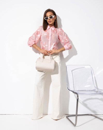 Elegancka koszula transparentna. Wykonana z lekkiego,elastycznego materiału. Model o prostym,klasycznym kroju z kołnierzykiem i zapięciem na guziki.Rękawy zakończone mankietami. Przezroczysta struktura nadaje koszuli kobiecego charakteru i wyjątkowego wyglądu , naszyte kwiaty dodają delikatności.. Idealna na wieczorne wyjścia, spotkania czy eleganckie stylizacje z nutą nowoczesności.