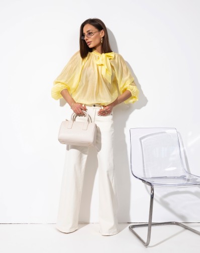 Elegancka koszula, która łączy w sobie wyjątkowy styl i komfort noszenia. Wykonana z cienkiej, zwiewnej tkaniny, doskonale sprawdzi się zarówno na co dzień, jak i na specjalne okazje.Koszula posiada subtelną szarfę przy szyi, która dodaje jej niezwykłego uroku i elegancji. Szarfa ułatwi stworzenie unikalnego looku.Długie delikatne rękawy zakończone niedużym mankietem.Paki nadaje jej ,delikatnego charakteru.Idealna na cieplejsze dni, zapewnia komfort noszenia i swobodę ruchów.