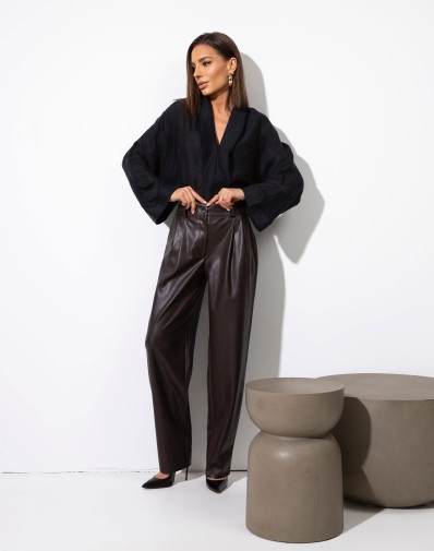Spodnie ze sztucznej skóry z zakładkami i bacznymi kieszeniami. Zapinane na klasyczny zamek i guzik. W pasie szlufki. Nogawka prosta