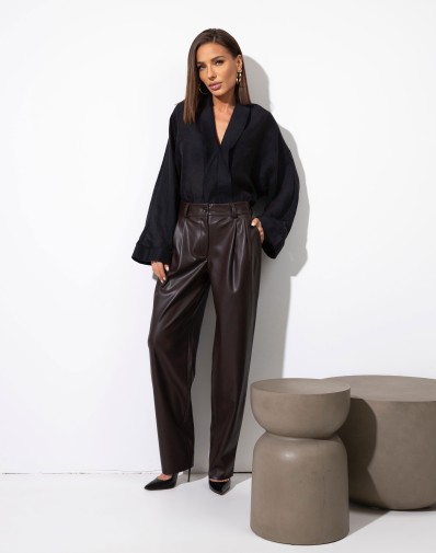 Spodnie ze sztucznej skóry z zakładkami i bacznymi kieszeniami. Zapinane na klasyczny zamek i guzik. W pasie szlufki. Nogawka prosta