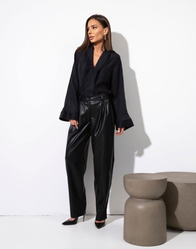 Spodnie ze sztucznej skóry z zakładkami i bacznymi kieszeniami. Zapinane na klasyczny zamek i guzik. W pasie szlufki. Nogawka prosta
