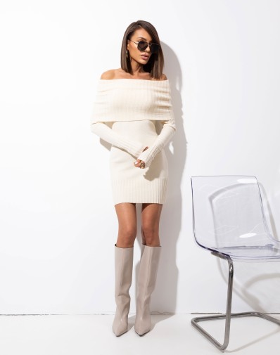 Dopasowana sukienka z elastycznego sweterkowego materiału, która podkreśla sylwetkę. Model 2w1 – golf możesz nosić luźno przy szyi lub opuścić na ramiona, tworząc kobiecy dekolt.Rękawy zakończone mankietem w wyrazisty prążek, identyczny jak dół sukienki i golf, nadają całości spójny i stylowy charakter.Miękka, elastyczna dzianina pięknie podkreśla sylwetkę i zapewnia komfort noszenia.
