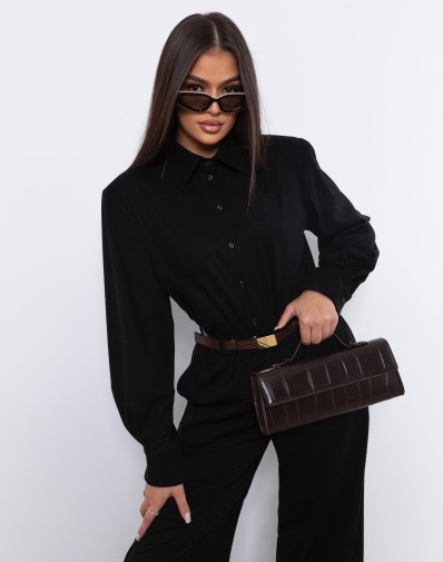 Koszula z eko skóry w czerni to idealna propozycja dla kobiet ceniących styl. Klasyczna koszula z kołnierzykiem i kieszeniami z klapami doskonale komponuje się z dopasowaną spódnicą o asymetrycznym przodzie,która także dostępna jest w naszej kolekcji. Całość tworzy nowoczesny, kobiecy look — perfekcyjny na spotkania, kolacje czy nawet na imprezę.