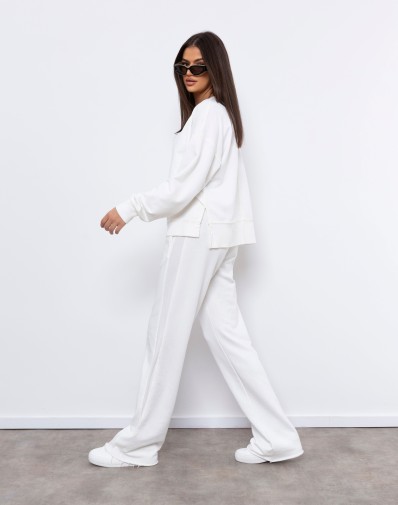 Postaw na wygodę i styl w jednym! Komplet dresowy wykonany z miękkiej, przyjemnej w dotyku dzianiny to idealny wybór na co dzień. Luźna bluza z opuszczoną linią ramion , rozcięciami na bokach ,nadaje swobodnego charakteru, a spodnie z wysokim stanem, elastyczną gumką w pasie i regulowanym sznurkiem gwarantują komfort noszenia przez cały dzień. Prosta nogawka z dekoracyjnymi prążkowanymi lampasami.Śmietankowy kolor kompletu nadaje lekkości.Wystylizujesz go na wiele sposobów .