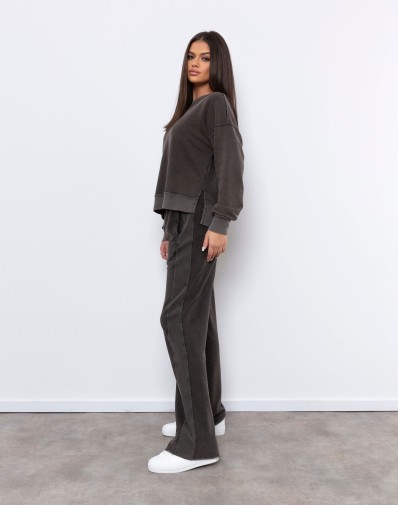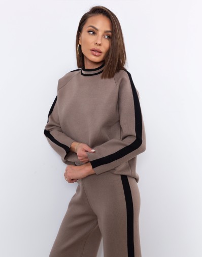 Ten komplet to idealne połączenie wygody i stylu. Uszyty z mięsistego, miękkiego materiału, który otula i daje wyjątkowy komfort noszenia. Spodnie mają luźny krój i wygodną gumę w pasie, dzięki czemu doskonale dopasowują się do sylwetki. Po bokach zdobią je eleganckie śmietankowe lampasy, które dodają całości charakteru. Idealny zestaw na co dzień, do pracy lub na spotkanie z przyjaciółkami.