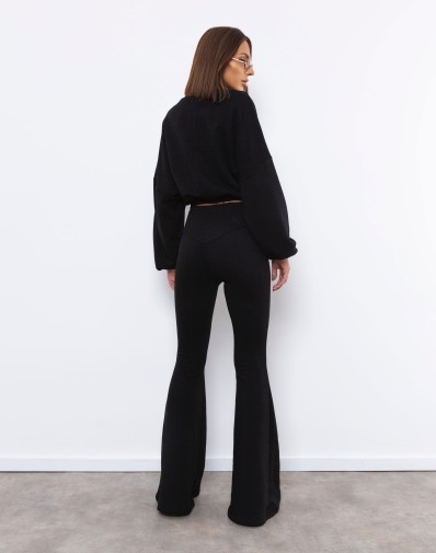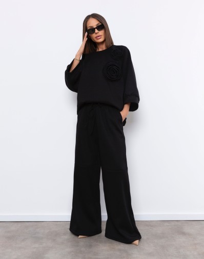 Stylowy i ultrakobiecy komplet, który łączy wygodę z modnym krojem. Bluza o luźnym fasonie z obniżoną linią ramion oraz gumą w pasie idealnie komponuje się z dopasowanymi spodniami z szerokimi nogawkami typu flare. Elastyczny pas podkreśla talię, a miękka, przyjemna w dotyku dzianina zapewnia komfort przez cały dzień. Czarny kolor dodaje klasyki i świetnie sprawdzi się zarówno w casualowych, jak i bardziej stylowych stylizacjach