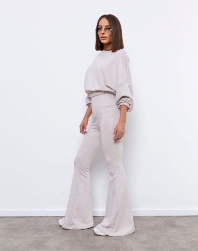 Stylowy i ultrakobiecy komplet, który łączy wygodę z modnym krojem. Bluza o luźnym fasonie z obniżoną linią ramion oraz gumą w pasie idealnie komponuje się z dopasowanymi spodniami z szerokimi nogawkami typu flare. Elastyczny pas podkreśla talię, a miękka, przyjemna w dotyku dzianina zapewnia komfort przez cały dzień. Jasny odcień dodaje lekkości i świetnie sprawdzi się zarówno w casualowych, jak i bardziej stylowych stylizacjach