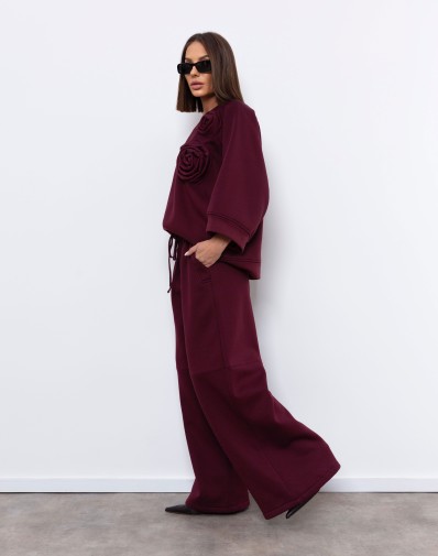 Postaw na wygodę w stylowym wydaniu! Nasz bordowy komplet dresowy to połączenie komfortu i nowoczesnego designu. Bluza o luźnym kroju ozdobiona jest efektownymi kwiatowymi aplikacjami 3D, które nadają całości wyjątkowego charakteru. Szerokie spodnie z gumką w pasie i troczkiem zapewniają pełną swobodę ruchów i idealne dopasowanie. To idealny wybór na co dzień, do pracy zdalnej czy weekendowy wypad za miasto.