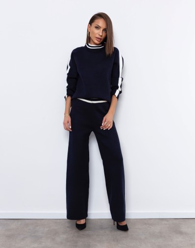 Ten komplet to idealne połączenie wygody i stylu. Uszyty z mięsistego, miękkiego materiału, który otula i daje wyjątkowy komfort noszenia. Spodnie mają luźny krój i wygodną gumę w pasie, dzięki czemu doskonale dopasowują się do sylwetki. Po bokach zdobią je eleganckie granatowe lampasy, które dodają całości charakteru. Idealny zestaw na co dzień, do pracy lub na spotkanie z przyjaciółkami.