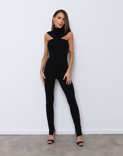 Stylowy kombinezon o obcisłym kroju, wykonany z elastycznej dziany, który świetnie modeluje sylwetkę. Góra z charakterystycznym, drapowanym wykończeniem dodaje elegancji i nowoczesnego charakteru. Model zapinany z tyłu na kryty zamek, dzięki czemu idealnie układa się na ciele.Efektowne rozcięcie na nogawkach. Perfekcyjny wybór na wieczorne wyjścia, eventy i stylizacje „wow”.