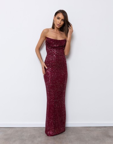 Elegancka sukienka wieczorowa w całości pokryta połyskującymi cekinami, które nadają jej efektownego, wieczorowego blasku. Model bez ramiączek pięknie podkreśla linię biustu, tworząc kobiecą i klasyczną formę. Sukienka jest wiązana z tyłu, dzięki czemu można dostosować jej szerokość do sylwetki, posiada także gumkę w pasie. Delikatnie rozszerza się ku dołowi, zapewniając lekkość i płynny, elegancki fason. Idealna propozycja na wyjątkowe okazje.Elastyczny materiał.
