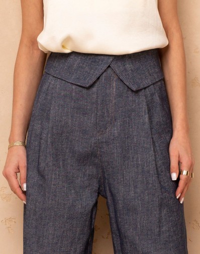 Eleganckie spodnie ala jeansowe , które łączą styl i wygodę. Wysoki stan pięknie podkreśla talię a asymetryczne ułożenie ją wyszczupla, a luźniejszy krój nogawek zapewnia swobodę ruchów i nowoczesny look. Zapinane na zamek i guzik, z praktycznymi zakładkami oraz kieszeniami z przodu, świetnie sprawdzą się zarówno w eleganckich, jak i codziennych stylizacjach.