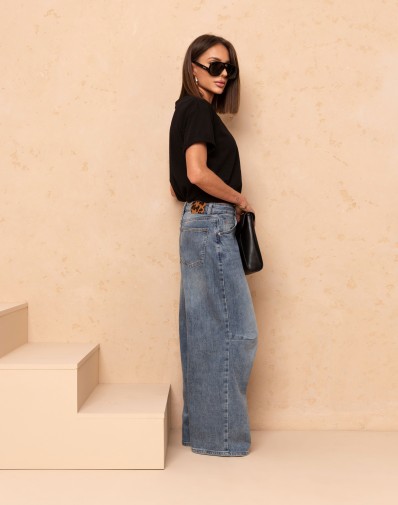 Stylowe i wygodne spodnie jeansowe z szerokimi nogawkami z wysokim stanem.Szerokie nogawki oraz ozdobne,złote guziki przy pasie nadają im nowoczesny,elegancki charakter .Wykonane z miękkiego denimu w klasycznym niebieskim odcieniu jeansu.Idealne zarówno do casualowych jak i bardziej szykownych stylizacji.