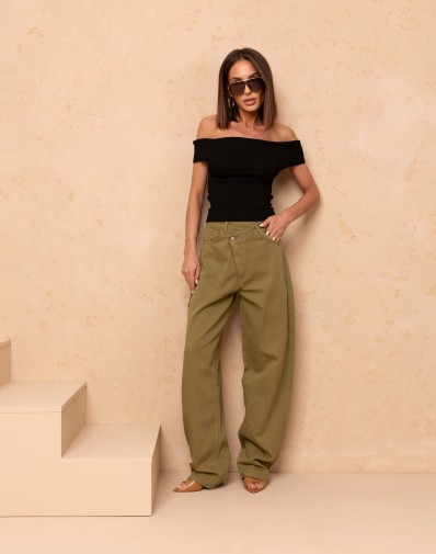 Jeansy z prostą nogawką uszyte z miękkiej, wysokiej jakości tkaniny. Model z wysokim stanem i asymetrycznym zapięciem na dwa guziki oraz suwak pięknie podkreśla talię i optycznie wydłuża sylwetkę. Idealne do codziennych stylizacji – świetnie wyglądają zarówno ze sneakersami, jak i z eleganckimi szpilkami.