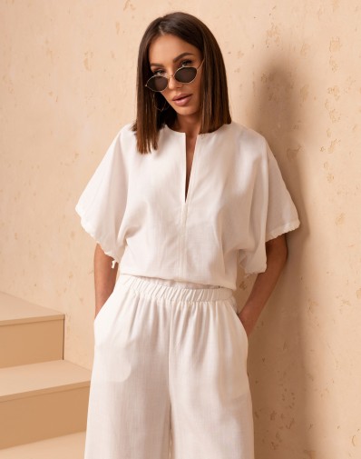 Stylowy i wygodny komplet składający się z luźniejszej bluzki oraz spodni o szerokich nogawkach. Góra ma swobodny krój i krótkie rękawy ze ściągaczem ,dekolt z głębszym wycięciem , które idealnie się układa . Spodnie wyposażone są w elastyczną gumkę w pasie, co zapewnia idealne dopasowanie i komfort noszenia, a dodatkowo posiadają praktyczne kieszenie po bokach. Szerokie nogawki nadają całości lekkości i modnego, niewymuszonego charakteru. To idealny zestaw na co dzień, podróże i letnie dni.