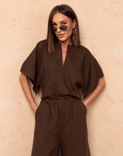 Stylowy komplet damski składający się z luźnej bluzki oraz szerokich spodni w modny, organiczny wzór w odcieniach brązu i beżu. Bluzka z dekoltem w serek (V-neck) oraz wiązaniem dodaje lekkości i kobiecego charakteru. Spodnie o szerokiej nogawce,z gumą w pasie oraz praktycznymi kieszeniami na bokach zapewniają komfort noszenia i swobodny, elegancki look. Idealny zestaw na co dzień i wakacyjne stylizacje.
